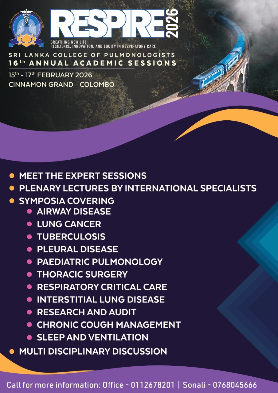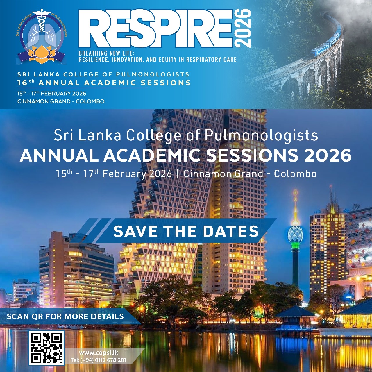 It is with great pride and responsibility that I present the vision of the Sri Lanka College of Pulmonologists for 2025/2026. Under the theme “Breathing New Life: Resilience, Innovation, and Equity in Respiratory Care,” we aim to strengthen resilience in our healthcare system, promote innovation, and ensure equitable access to respiratory care across the country.